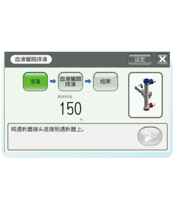 具備預(yù)沖輔助程序,可輔助臨床完成動(dòng)靜脈管路和透析器的預(yù)沖、密閉循環(huán)、跨膜預(yù)沖,簡(jiǎn)化臨床操作,實(shí)現(xiàn)充分預(yù)沖。